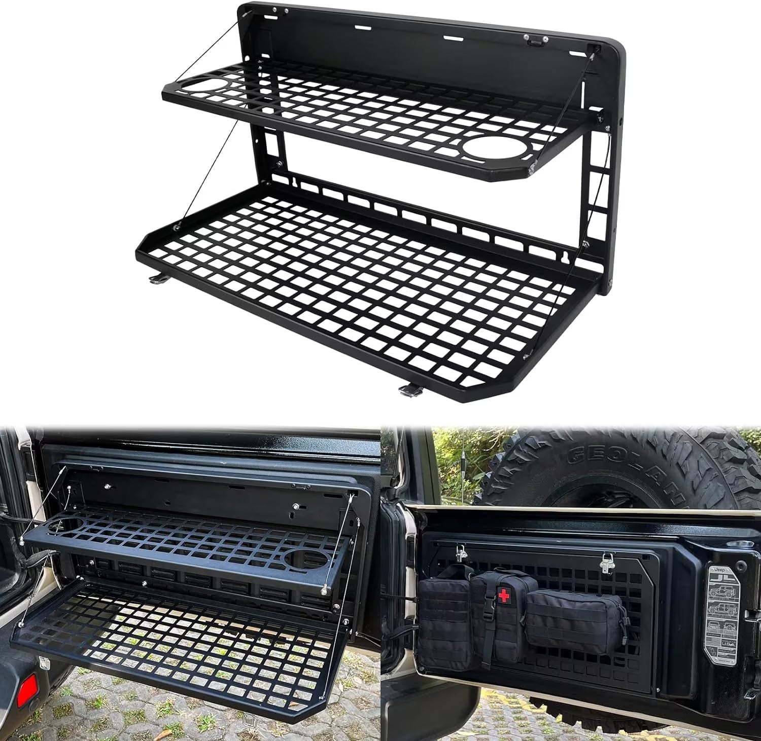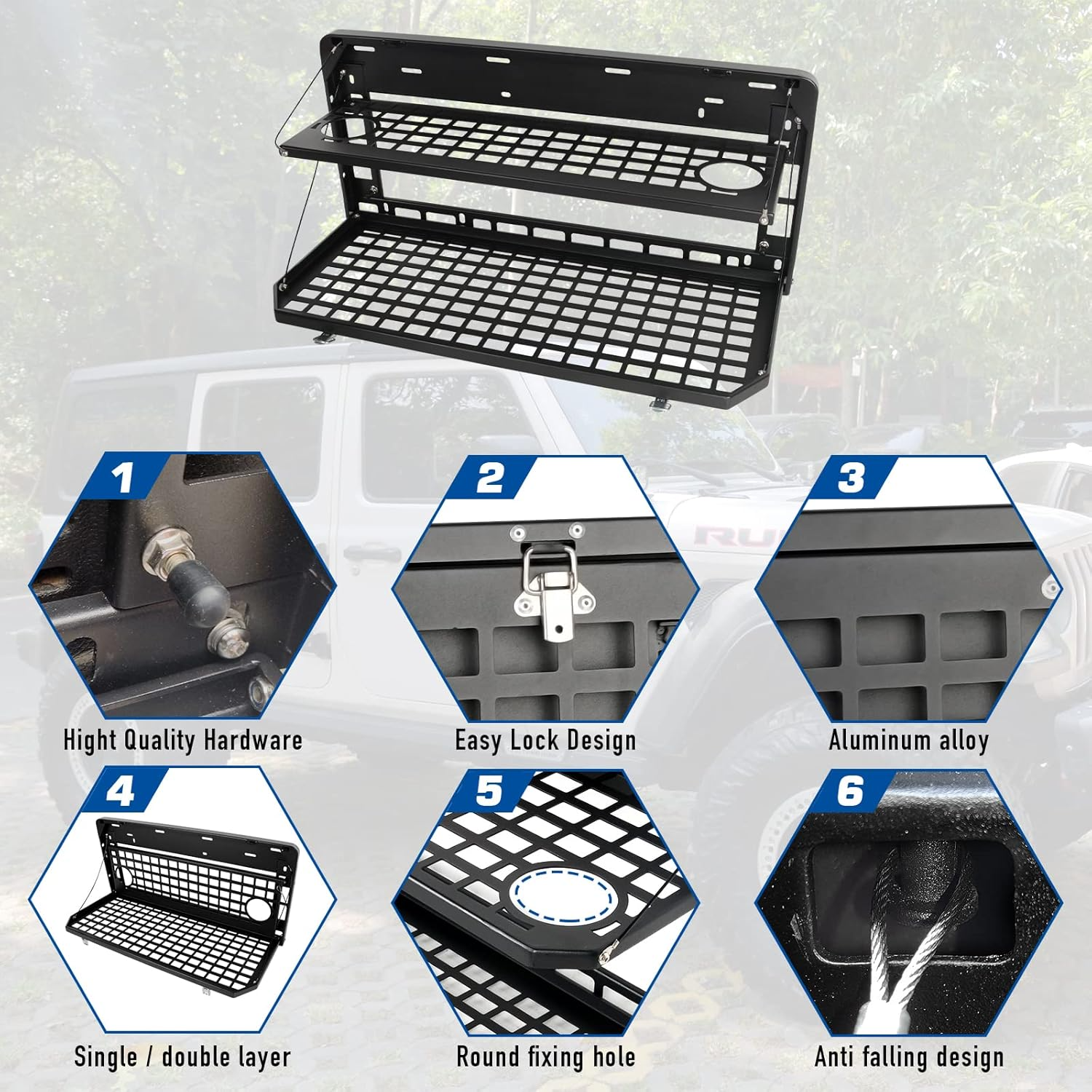 Product Name: 2-Tier Tailgate Table Rear Foldable Storage Cargo Rack Outdoor Camping Desk for 2007-2022 Jeep Wrangler JK&JL 4 Door (Not Fit JK Models with Stock Subwoofer)