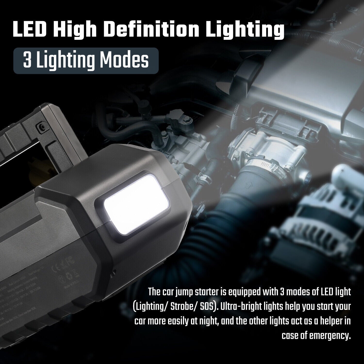 In addition to jump-starting your vehicle, this device also functions as a USB power bank, allowing you to charge your mobile phone or laptop via its 5V/3A USB output port. It also features a super powerful LED flashlight with strobe for emergency SOS signals.