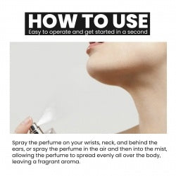 Its use method is very simple: spray the perfume on the wrists, neck, behind the ears, or spray the perfume in the air and then mist, so that the perfume evenly distributed throughout the body, leaving a fragrant aroma.