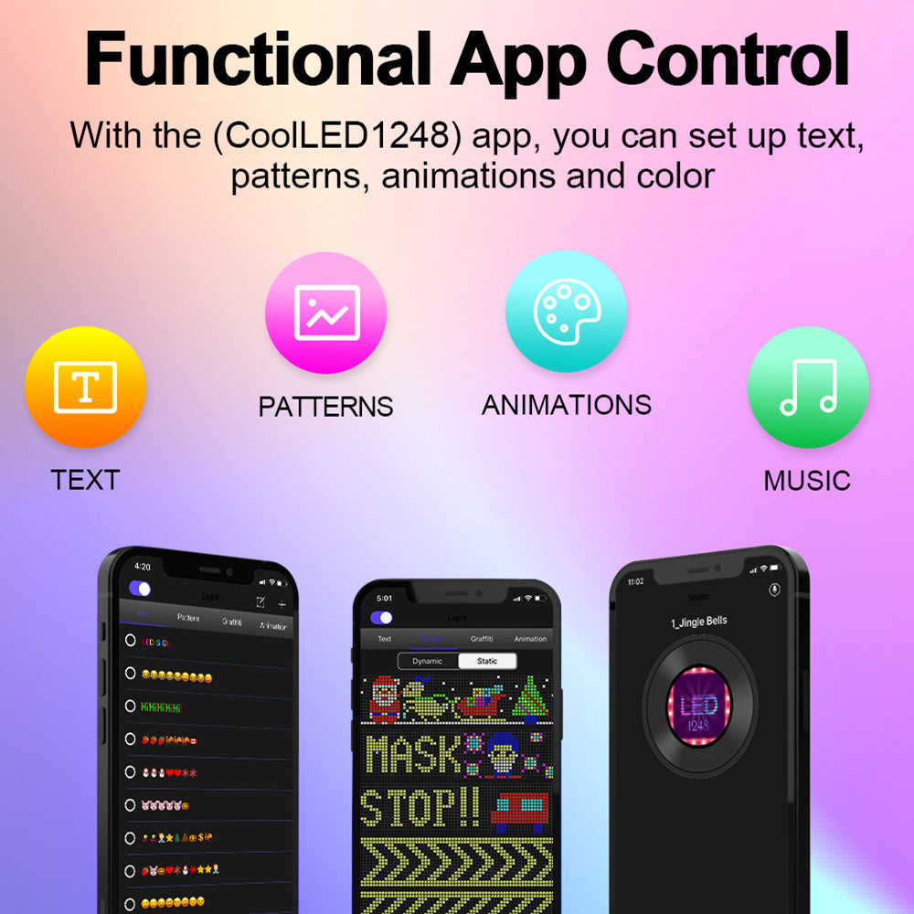 2, mobile phone download APP operation, you can customize the content, material Library also has a large number of materials can be used directly, Bluetooth connection, no network connection, easy to control;