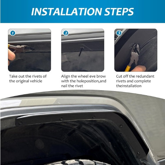 - WIDENING DESIGN - It can solve the problem that the original fender flare are not wide enough after replacing large-size tires, and at the same time, it can effectively prevent sand and stone from splashing and scratching the original paint.