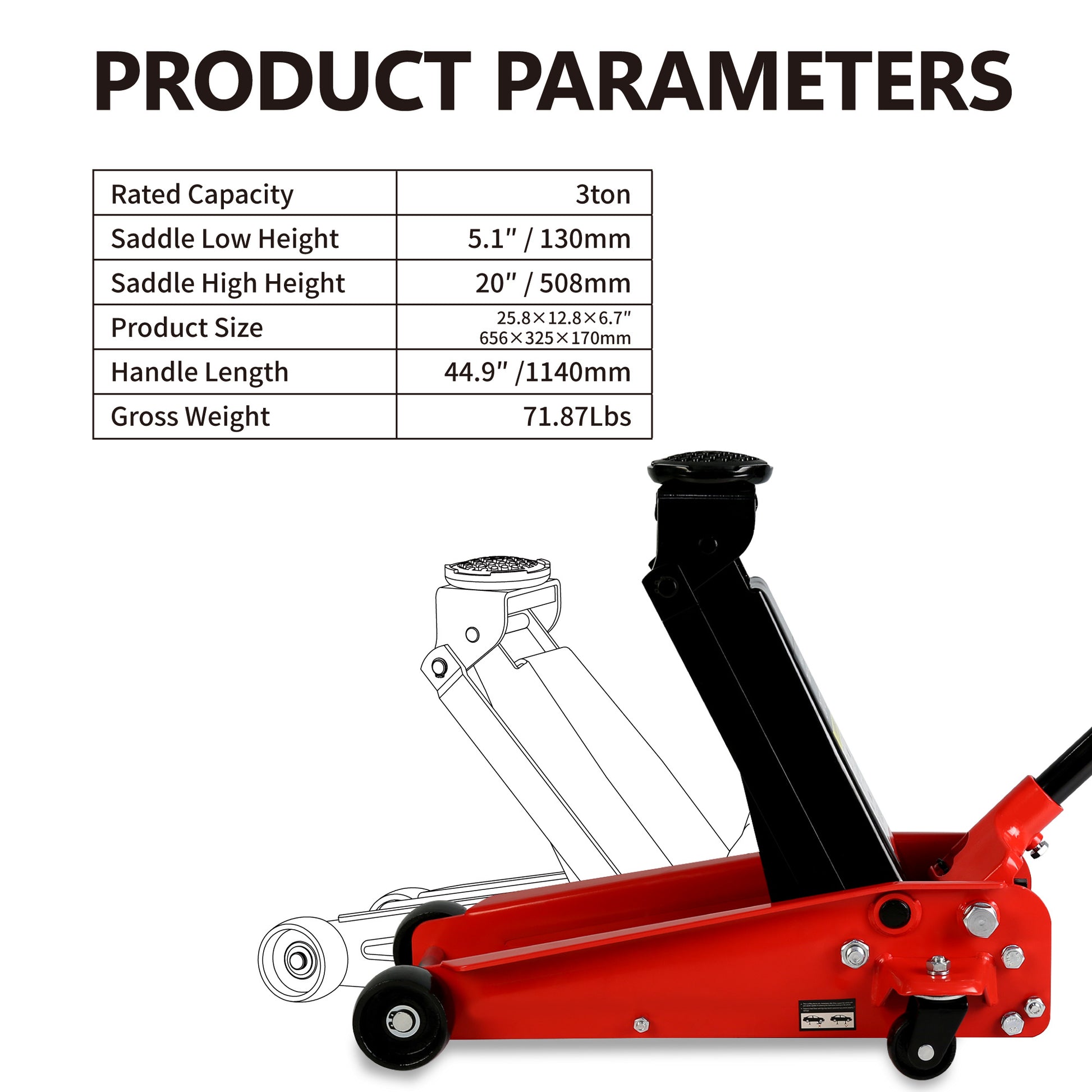Hydraulic garage jack is constructed with heavy duty steel, providing long term quality and durability for every day and industrial use
