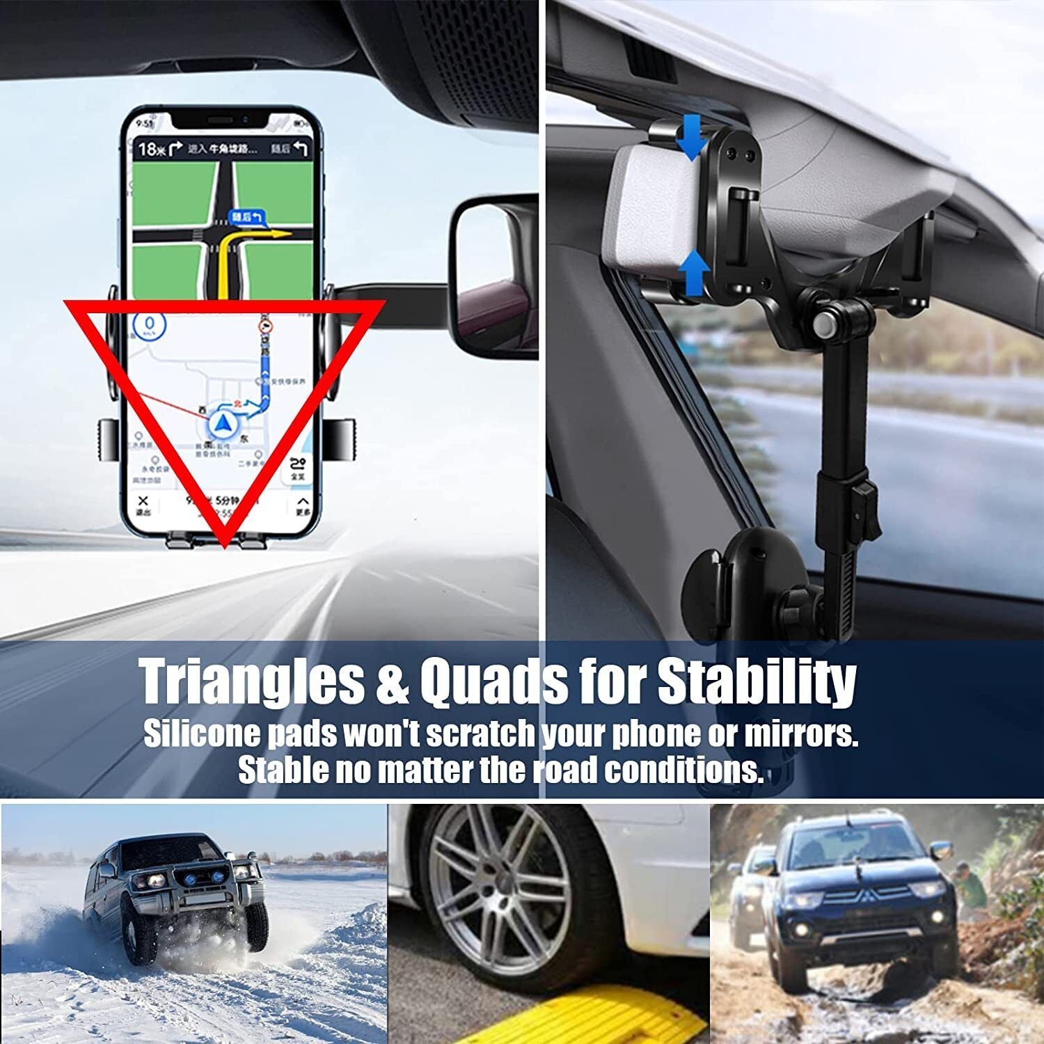 【Tightly Locked And Stable】 The four-claw design of the rotatablea and retractable and there are anti-friction pads at the four corners, will not scratch the mirror. car phone holder holds the phone firmly in place no matter how bumpy the road is.