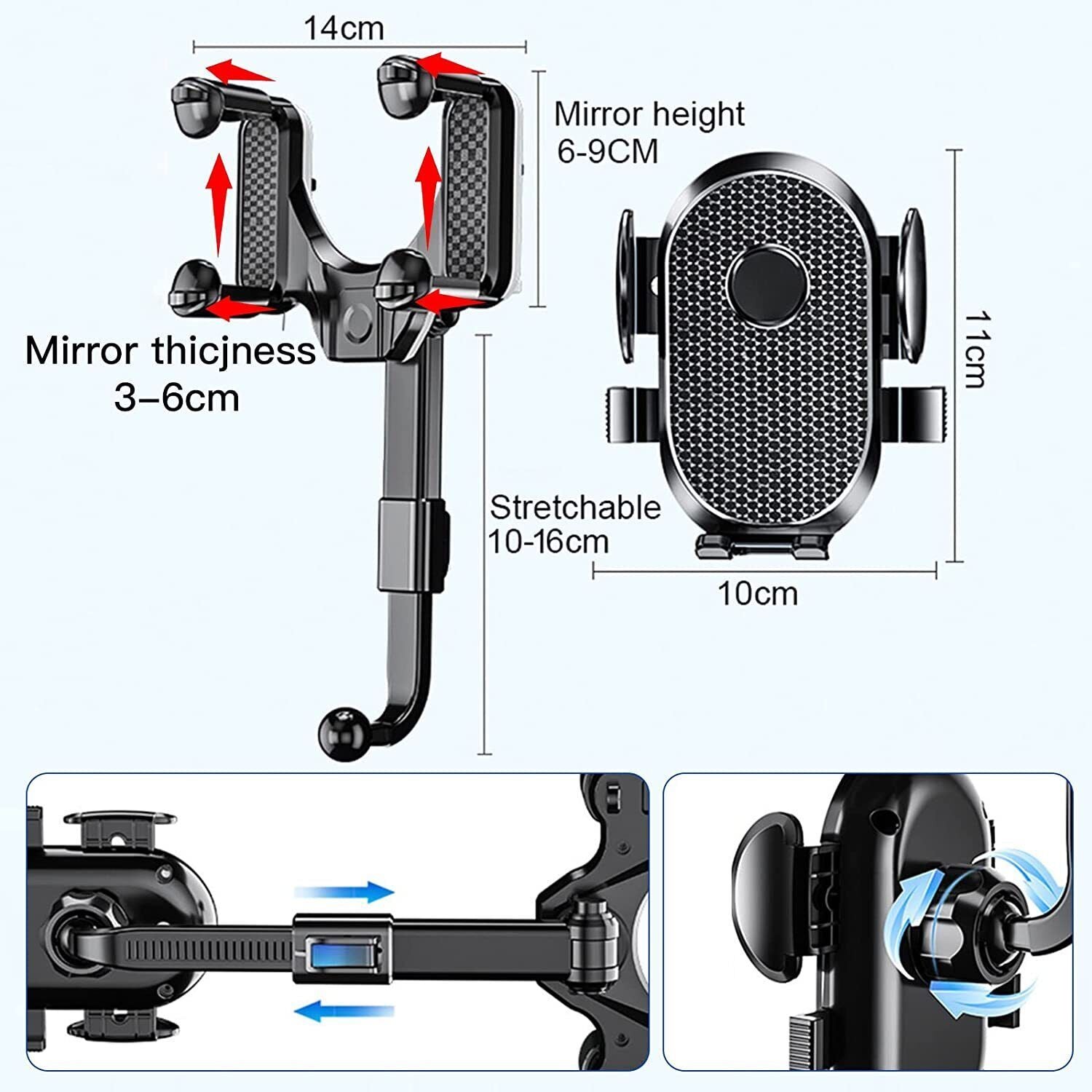【 Rotatable and Retractable】 This Rear View Mirror Phone Holder can be rotated 360 degrees. You can rotate it to the best angle and it will not affect your view when driving.