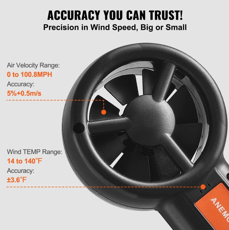 - 4-in-1 Precision Measurement: Experience the power of integrated technology as our anemometer measures wind velocity, wind temp, air flow, and wind chill. From a gentle zephyr to a gusty gale, our wind meter covers the full spectrum with a wind speed range of 0 to 100.8mph (5%+0.5m/s) and a wind temperature range of 14 to 140°F (±3.6°F). Get data you can rely on, no matter the conditions.