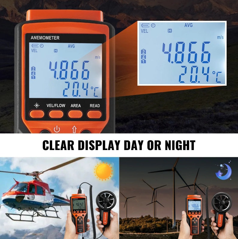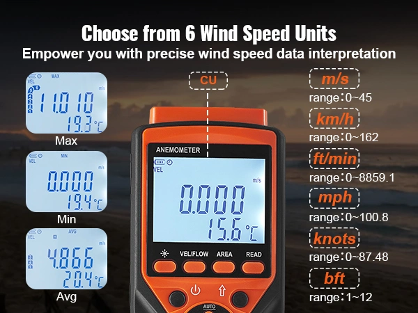 - 24/7 Clarity You Deserve: Say goodbye to guesswork, day or night. Our anemometer boasts a distinctive LED backlight screen that ensures effortless readings in any lighting conditions. Choose the wind speed with six different units – m/s, km/h, ft/min, mph, knots, and supports bft. MAX/MIN/AVG/CU wind speed display. Tailor your measurements to your liking and stay in control.