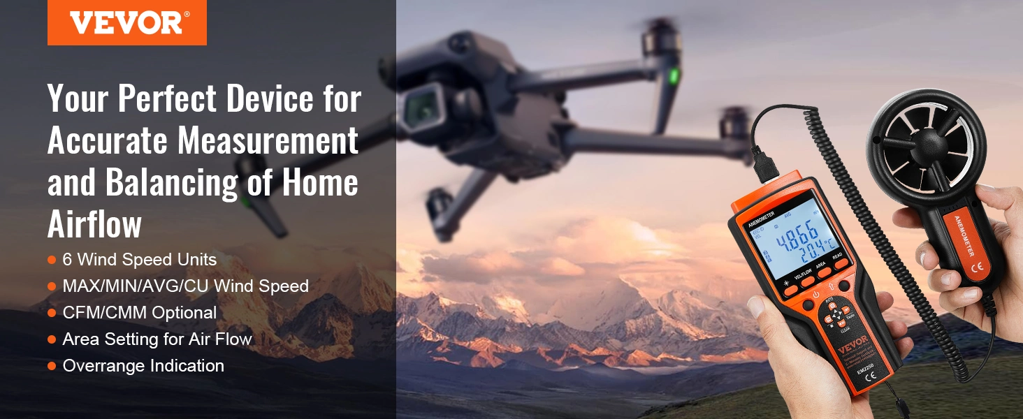 Explore nature, master every breeze with our anemometer! Our 4-in-1 wind speed meter measures wind velocity, wind temp, air flow, and wind chill. IP44 waterproof(excluding the vane unit), 6 wind speed units, LED backlit display, it has got you covered! Ready to elevate your wind experience?