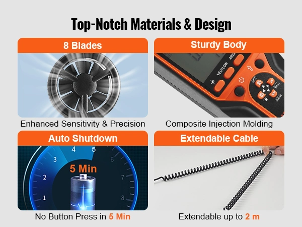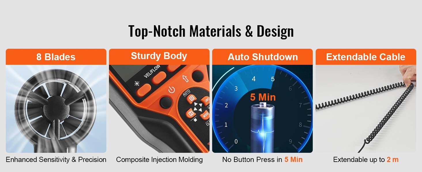 Experience durability with our ABS+TPE constructed anemometer! Crafted from high-quality ABS and TPE material, our air flow meter is engineered to withstand diverse environmental challenges, ensuring long-lasting durability and top-notch performance. Feel the difference with every use.