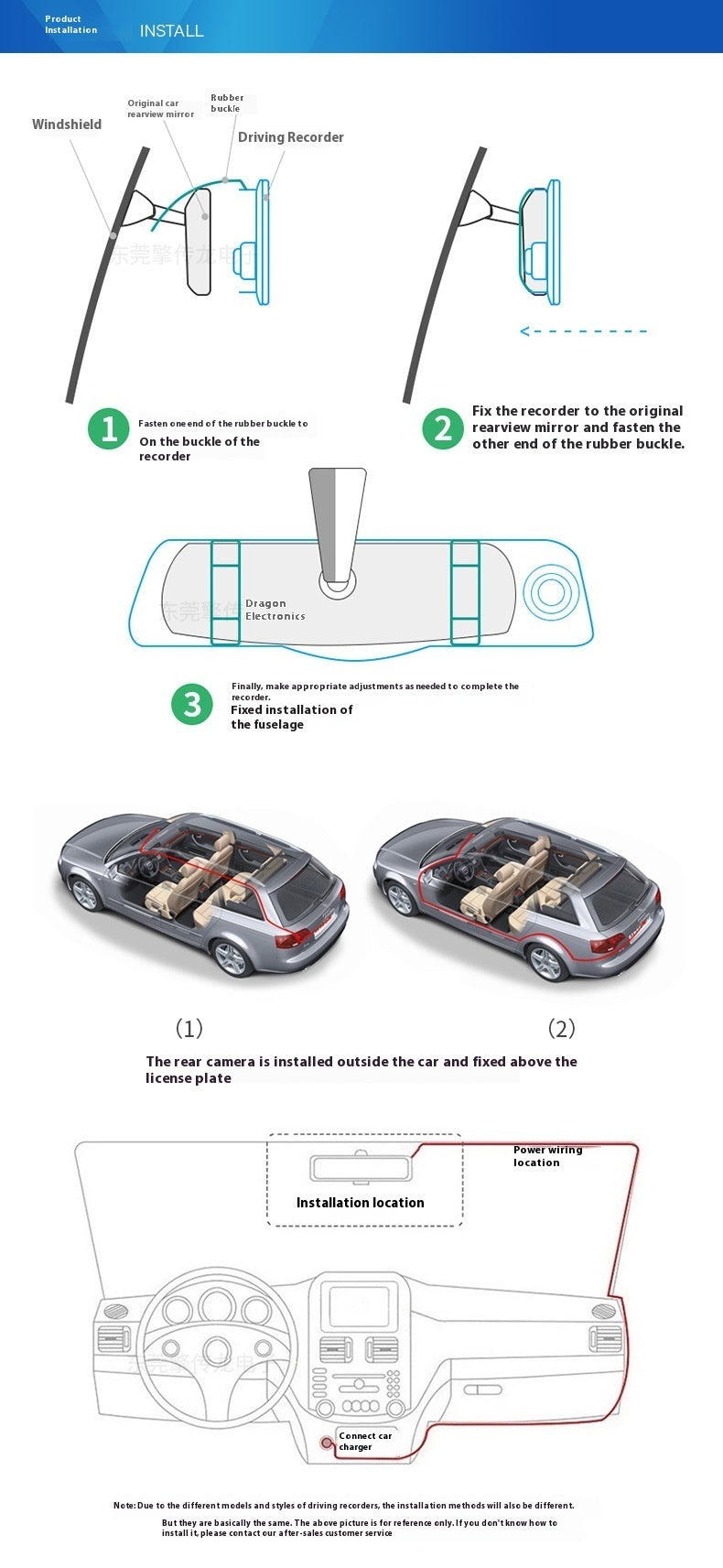 Functions: reversing image, motion detection, loop video, enhanced night vision, front and rear video