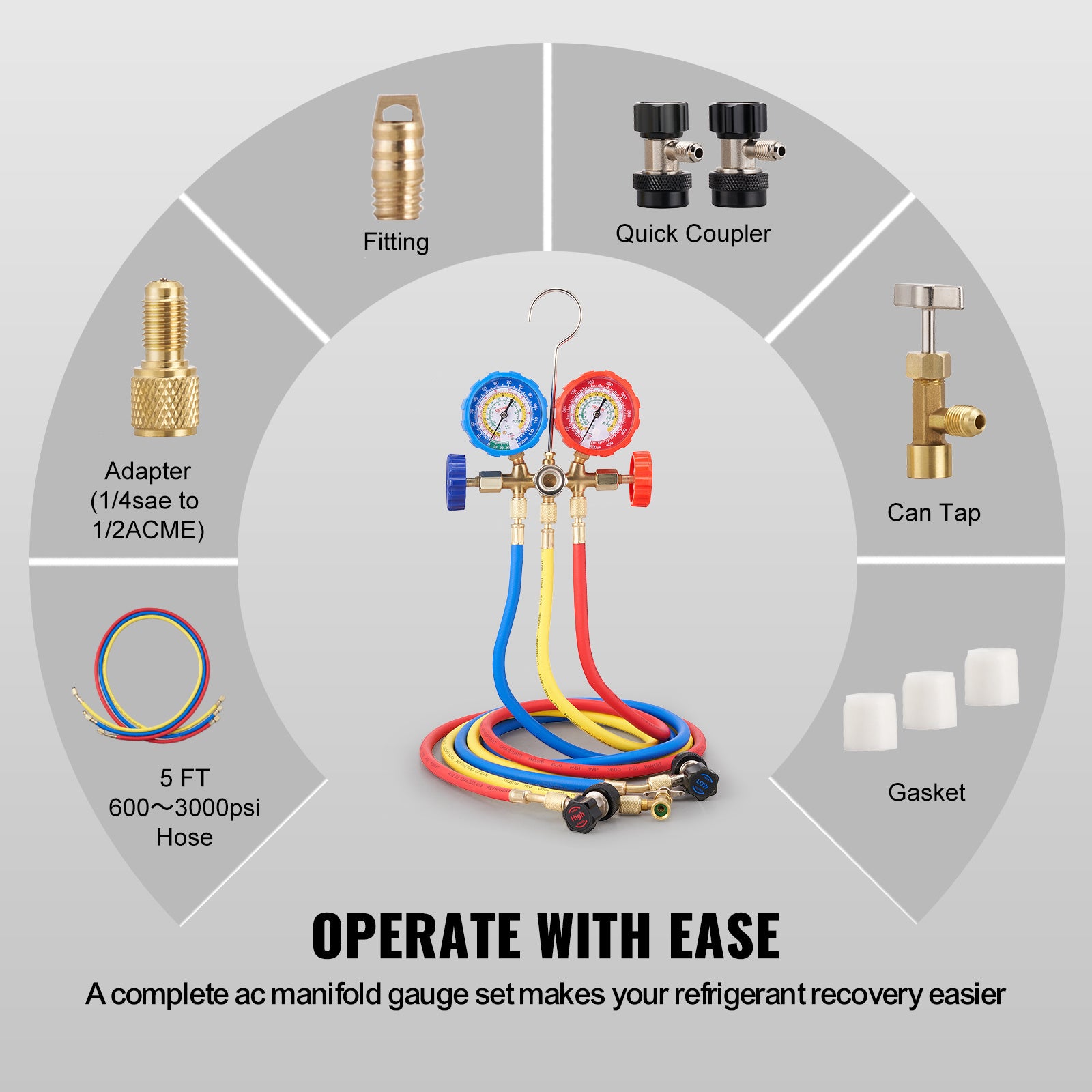 VEVOR AC Gauge Set - 3 Way AC Manifold Gauge Set For R134A R22 R12 R502 Refrigerant, Freon Gauges With 5ft Hoses, Couplers, Can Tap Works On Car Auto Freon Charging And Evacuation